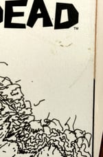 This sketch cover variant of Walking Dead #150 features some original zombie art on the cover. One of a kind. A few scuffs and a bit of a bend on it, cuz I drew on it and I can't really be super delicate when doing that. So it's not in pristine condition, but then, it's literally drawn on. So I've included pictures of both the cover, close-ups of the art and close-ups of the scuffs and wrinkle.